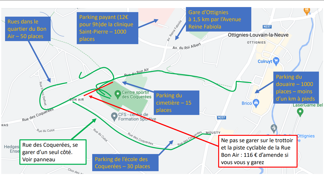 - Suivez les panneaux vers Ottignies puis vers le Centre sportif des Coquerées.