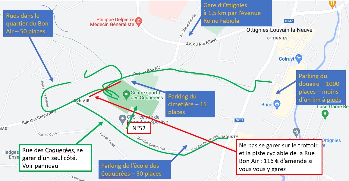 • Suivez les panneaux vers Ottignies puis vers le Centre sportif des CoquerĂ©es.